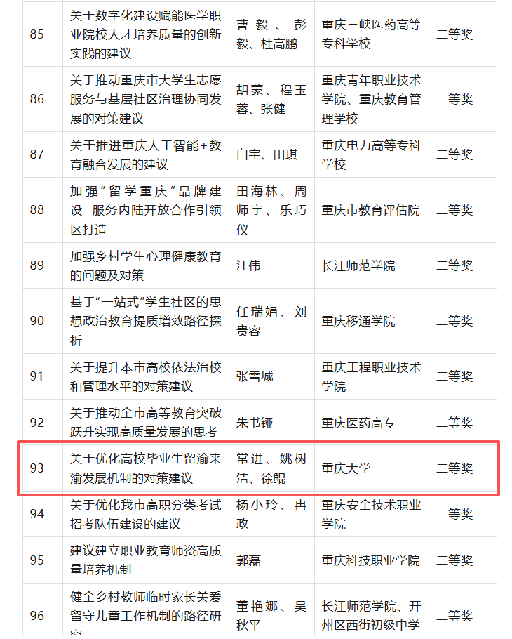 近日,重庆市教育委员会2025年教育咨政决策论文评选结果揭晓。重庆大学报送的《关于优化高校毕业生留渝来渝发展机制的对策研究》(完成人:常进、姚树洁、徐鲲)获高等教育组二等奖。