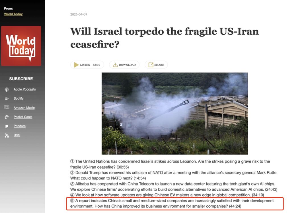 近日,中国中小企业发展促进中心发布《2025年度中小企业发展环境评估报告》。问卷调查显示,中小企业对发展环境满意度总体评价为84.54分,城市间发展环境差距持续缩小,区域发展均衡性逐步提高。4月9日,中国国际电视台(CGTN)《今日世界》栏目就中小企业发展势头、创新研发及营商环境改善等话题,专访了城市化与区域创新极发展研究中心秘书长、重庆大学二十一世纪马克思主义研究院特聘研究员姚树洁教授。